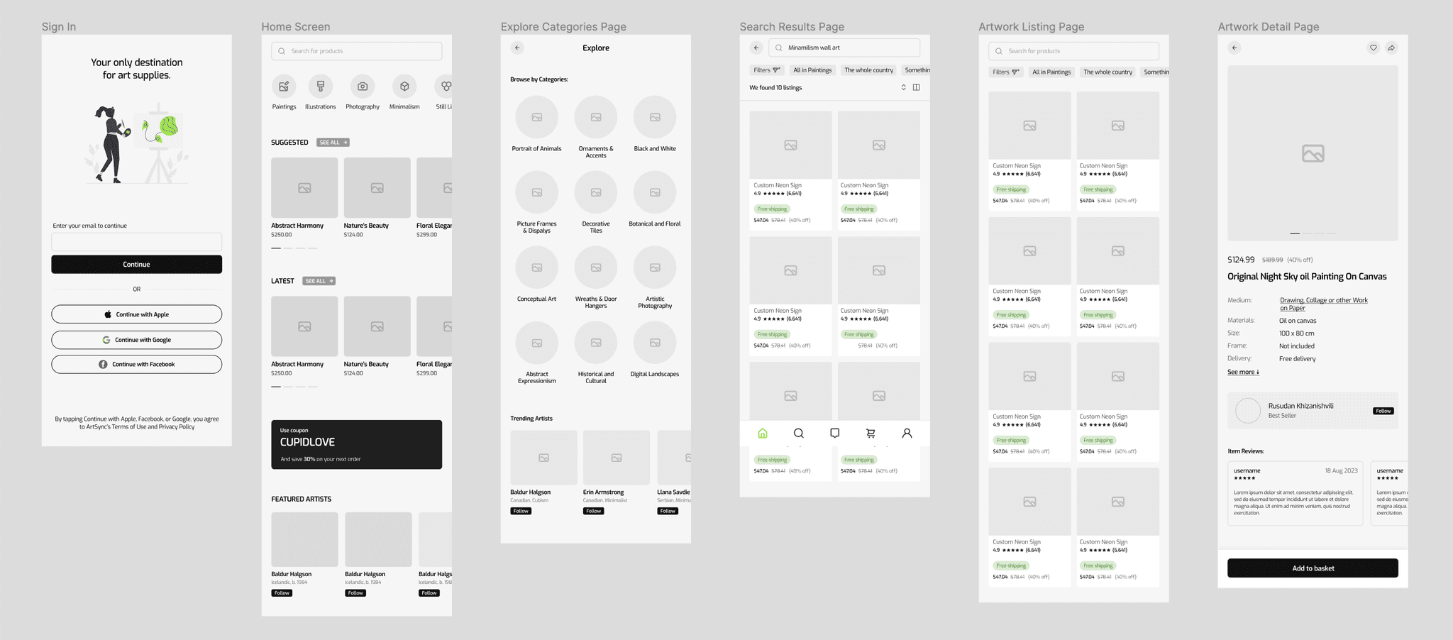 The app includes user-friendly sign-up and login processes, a home screen that displays the latest products and most popular art pieces across various categories, and a dedicated explore tab tailored to help users discover new artwork that meets their specific preferences. Additional functionalities include a search feature, listing pages, detailed art descriptions, artist profiles, and more.