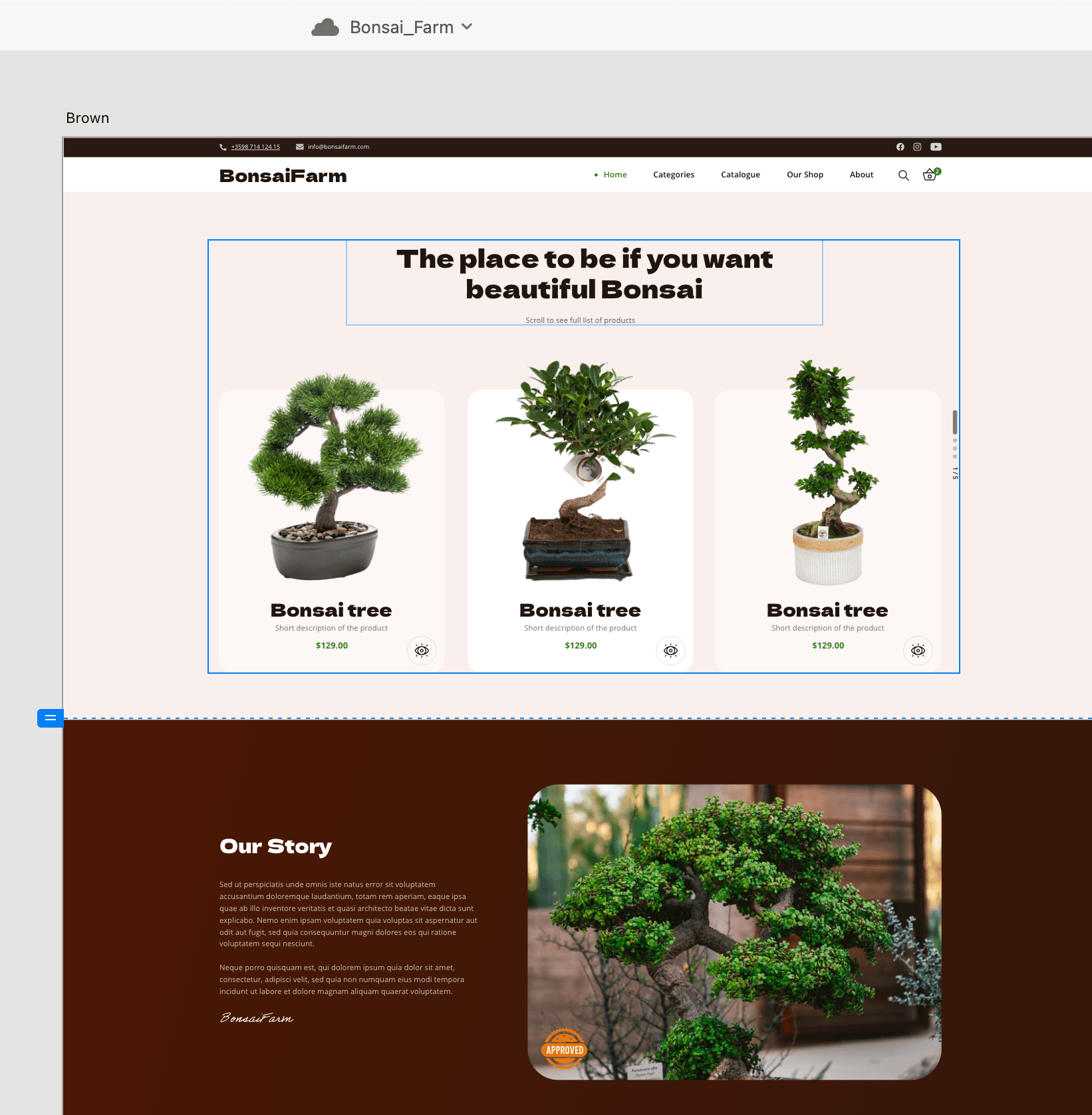 BonsaiFarm is an online e-commerce website that sells Bonsais trees. I developed the homepage as I was testing different color combinations. I loke how different elements overlap with each other and it creates a feeling for depth of field.