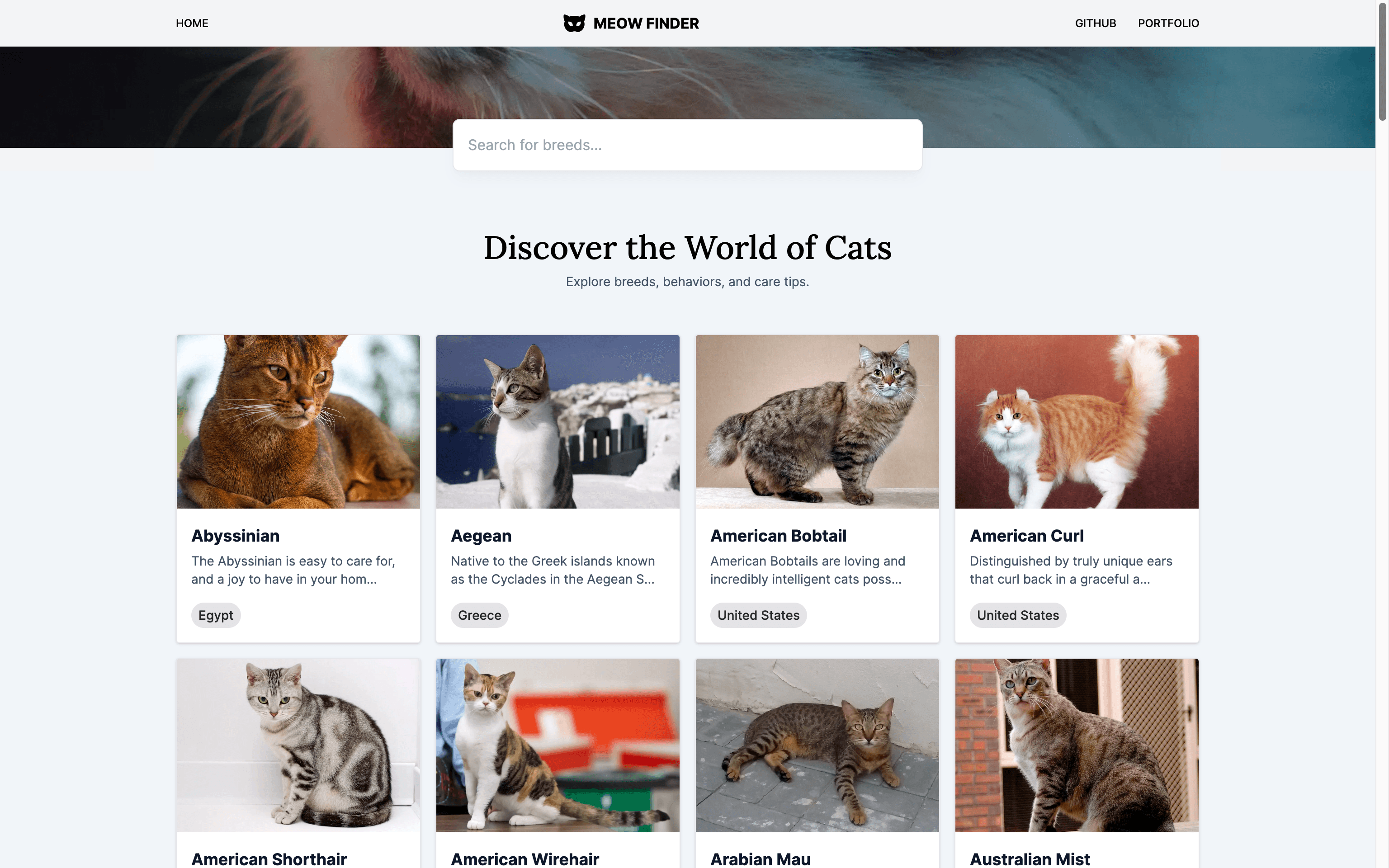 - Search Functionality: Includes a search feature that lets users find specific cat breeds.